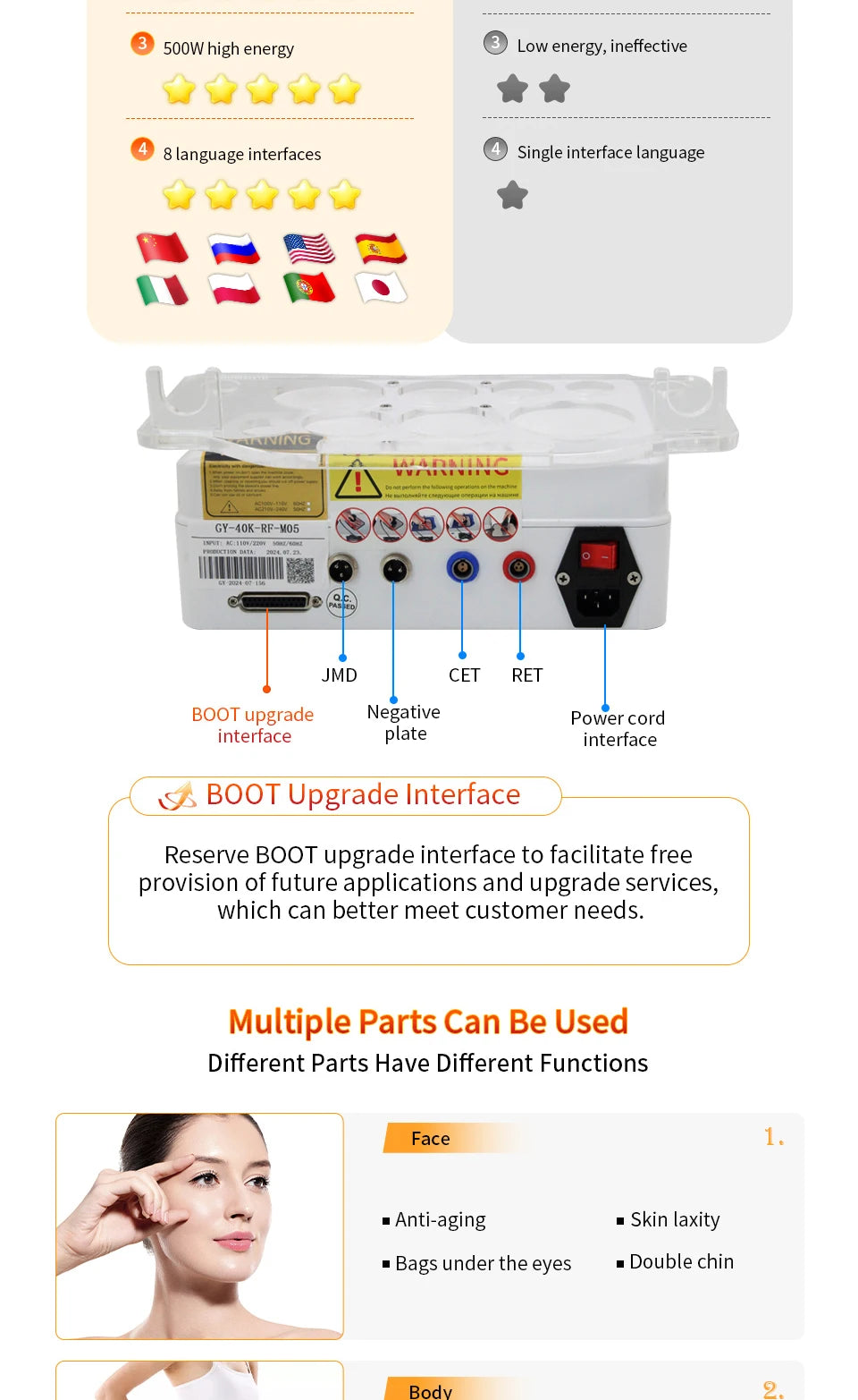 448KHZ is a more appropriate frequency for regulating the activity of ions inside andoutside the cell. lt can effectively help the ions to move across the membrane throughthe cell membrane channel, so that the positive and negative ion exchange of the celis restored to normal, thereby balancing the positive and negative charge of the cell and enhancing the activity of the cell Help cells repair their natural functions. This technology has been clinically verified and acts on the body from the inside out to satisfv vour effective aesthetic effect in an effective and painless way. Provide beauty care solutions for a wide range of beauty applications.