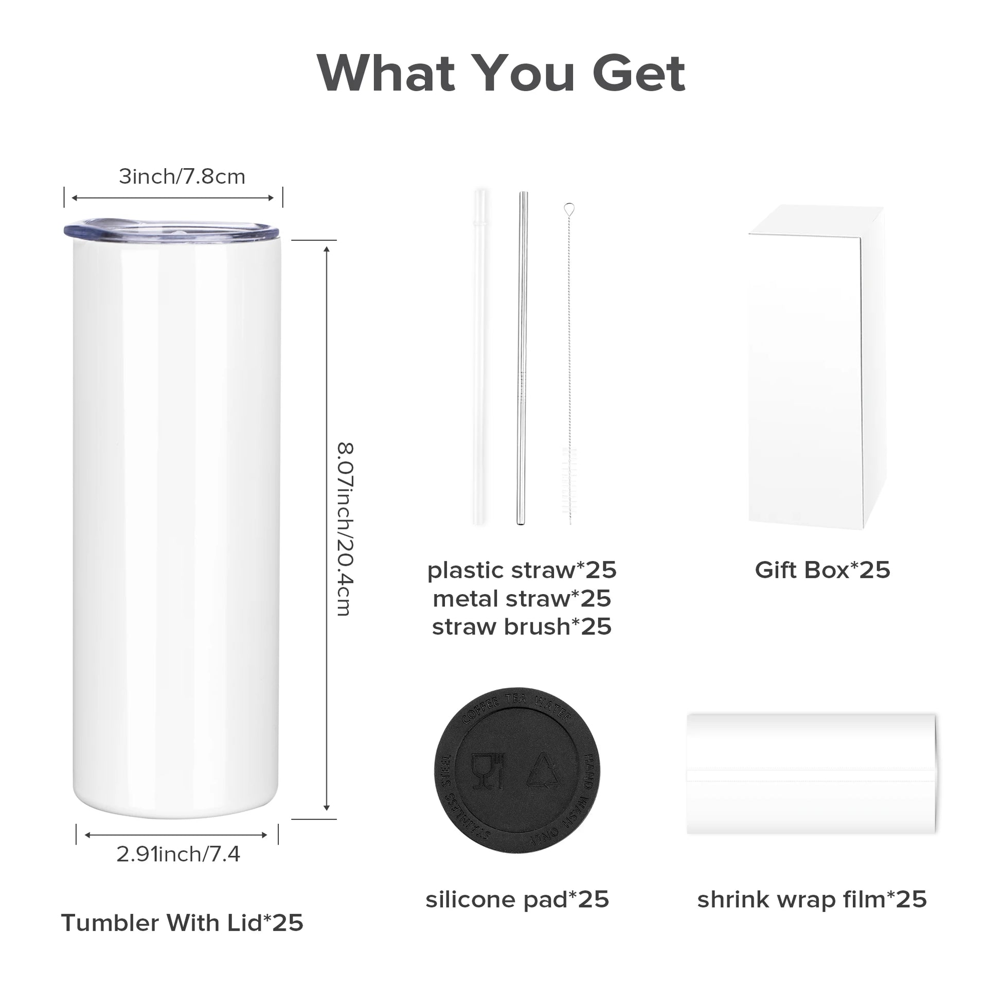 Sublimation Tumblers Blanks 20 oz 25 Pack Skinny Straight Tumblers Bulk Stainless Steel Insulated Sublimation Cups with Lid and